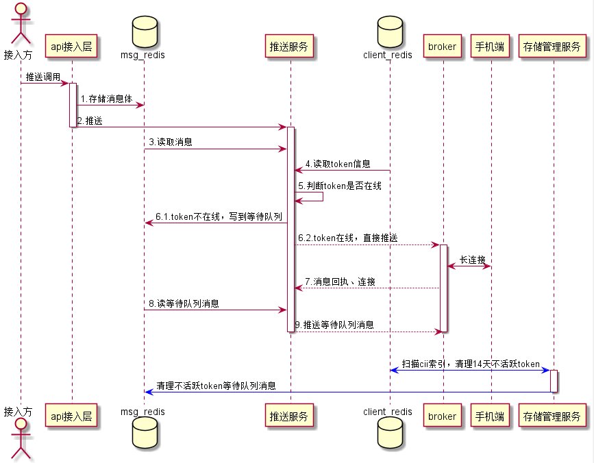 4)存储管理服务,会定期扫描cii索引,根据cii存储的最后更新时间,如果14天都没更新,说明是不活跃用户,会清理该token信息,同时清理该token对应的等待队列消息。