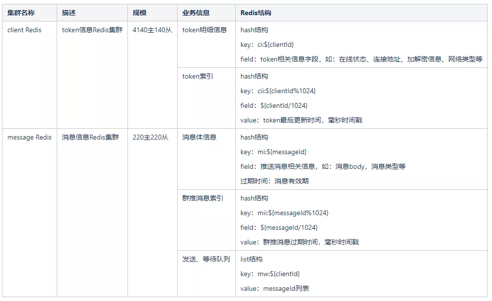 基于vivo推送平台的特点,对并发和时效性要求较高,并且消息数量多,消息有效期短。所以,推送平台选择使用Redis中间件作为消息存储和中转,以及token信息存储。之前主要使用两个Redis集群,采用Redis Cluster 集群模式。两个集群如下: