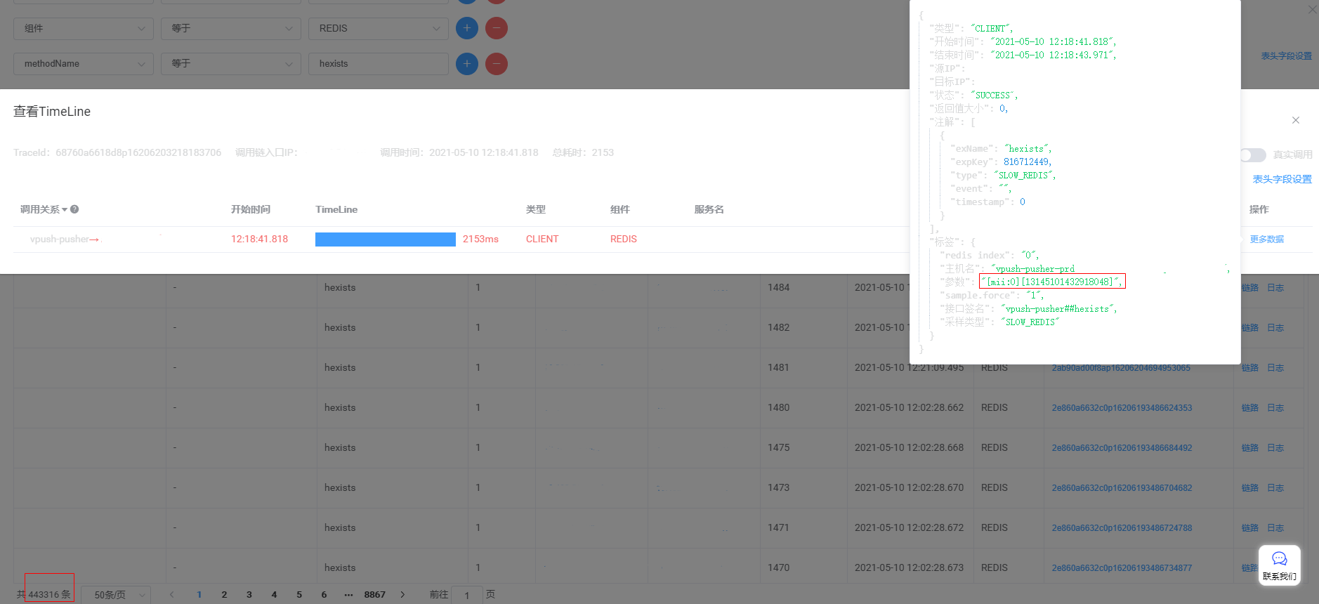 通过高峰期抓取调用链监控,从下图可以看到,我们11:49到12:59这期间调用msg Redis的hexists命令耗时很高,该命令主要是查询消息是否在mii索引中,链路分析耗时的key大都为mii:0。同时对问题节点Redis内存快照进行分析,发现mii:0容量占比很高,存在读取mii:0热点问题。