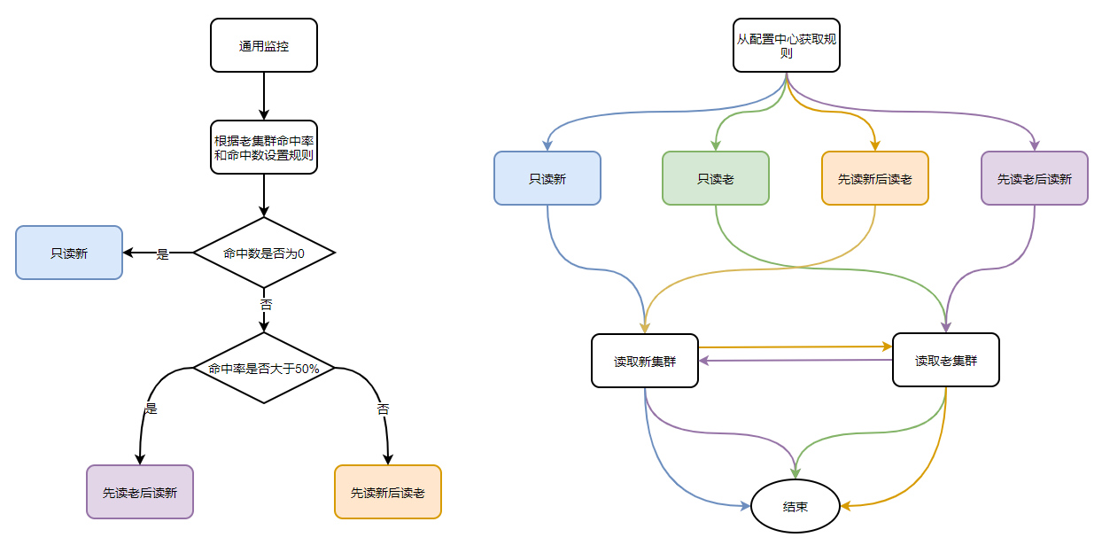 规则的判断依据:根据老集群的命中数和命中率决定。上线初期规则配置“先读老再读新”;当老集群命中率低于50%,切换成"先读新后读老";当老集群命中数为0后,切换成“只读新”。