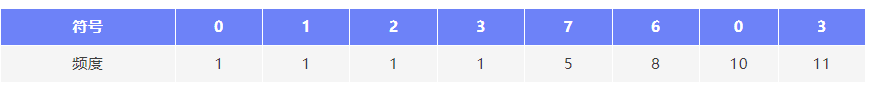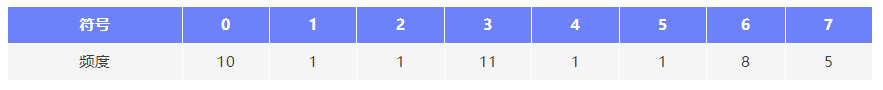 假如待编码的字符总共38个符号数据,对其进行统计,得到的符号和对应频度如下表: