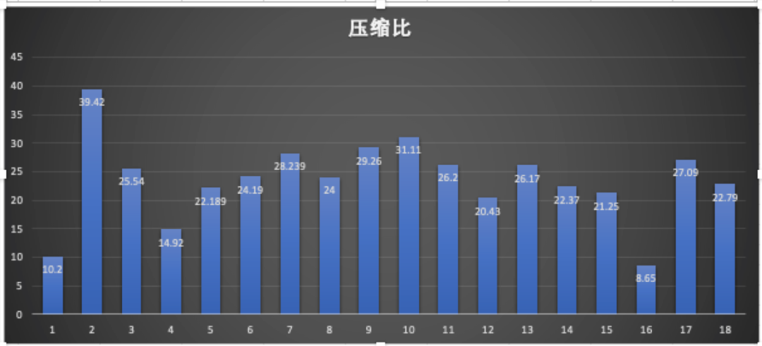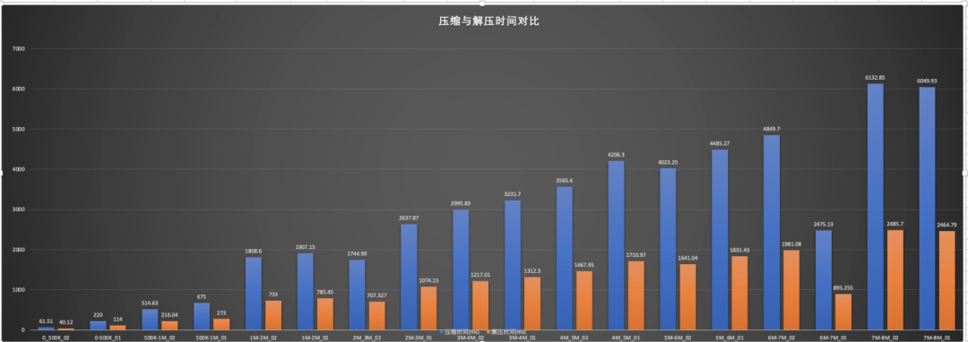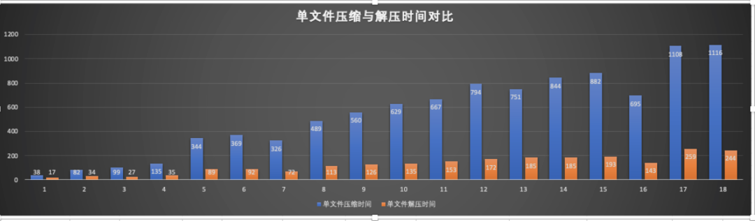 上图是不同大小的文件压缩与解压缩时间比例图,橙色是解压时间,蓝色是压缩时间。