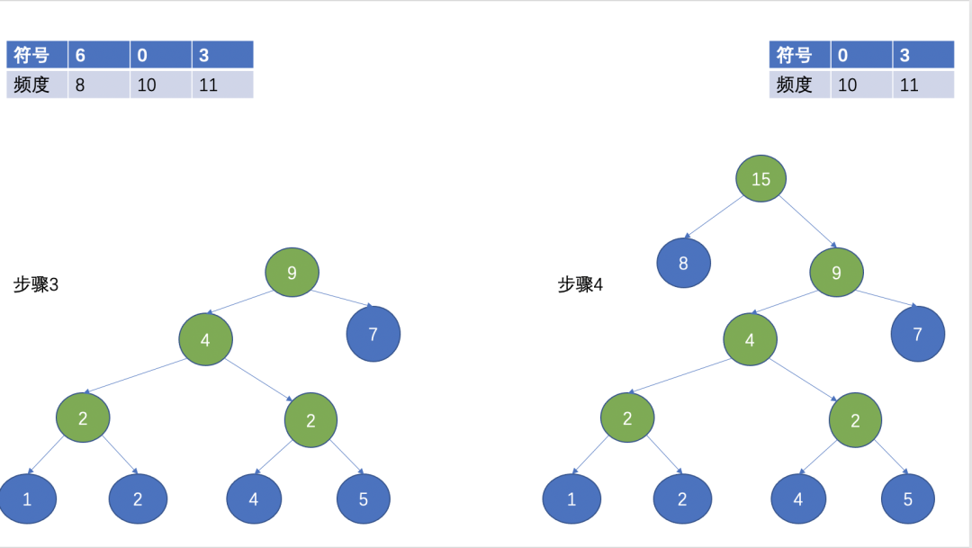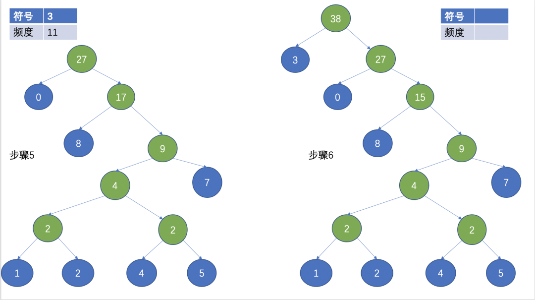 然后,选择两个频数最小的作为叶子节点,频数最小的作为左子节点,另外一个作为右子节点,根节点为两个叶子节点的频数之和。