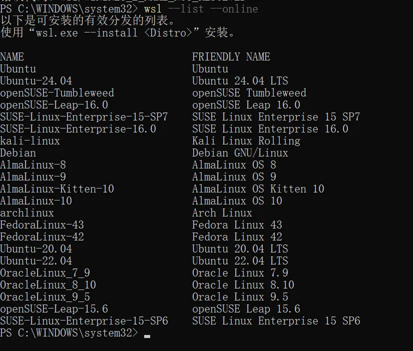 2、查看linux系统与版本(此步骤需要翻墙):wsl --list --online