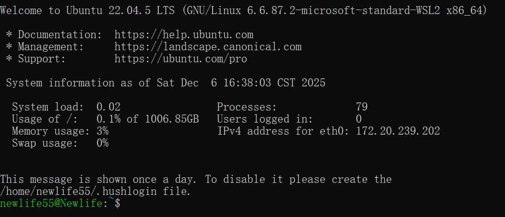 关闭 WSL 并重启,验证默认用户:wsl --shutdown