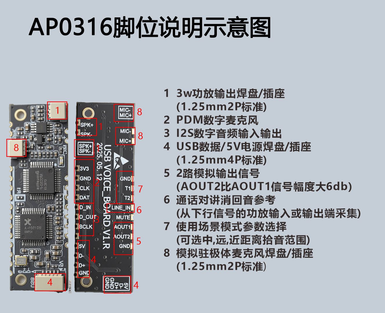 AP-0316提供数字、驻极体麦克风两种音频输入方式,输出涵盖模拟音频、I2S数字音频、USB声卡模式。内置3W功放,可直连扬声器或小音箱,搭配USB声卡模式,轻松实现双向语音交互。其具备多种工作模式和不同灵敏度程序,回音消除高达100dB,环境噪音压制出色。