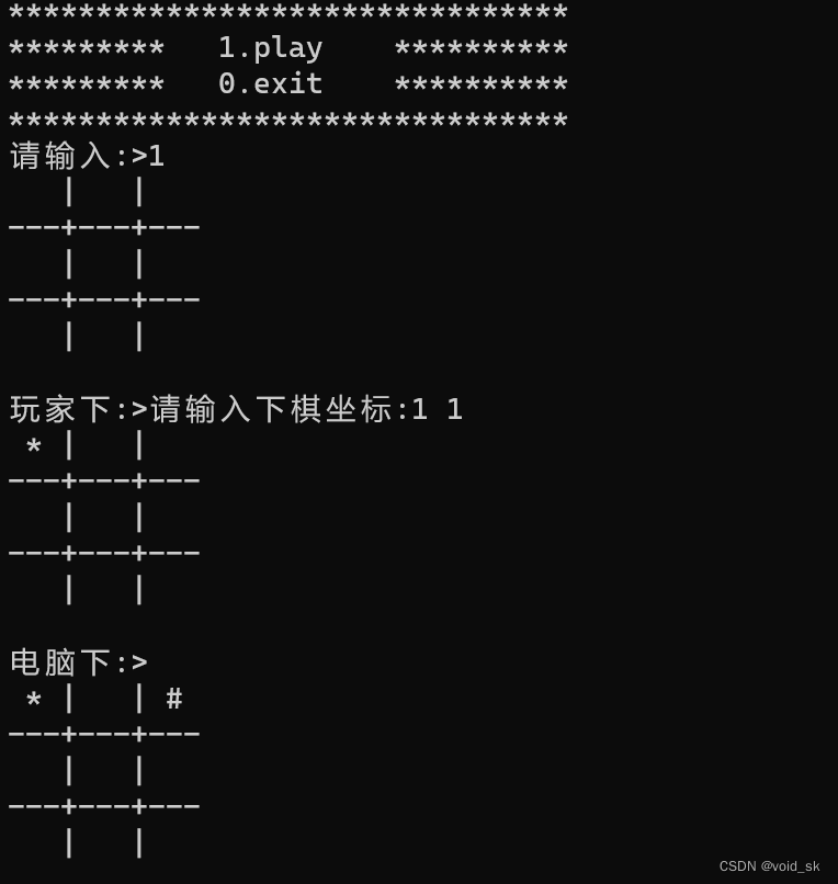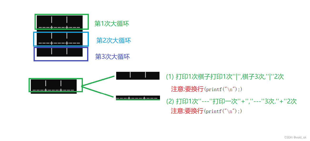 (3)test.c中为了让游戏持续进行要用while(1),而且需要下棋后打印棋盘.