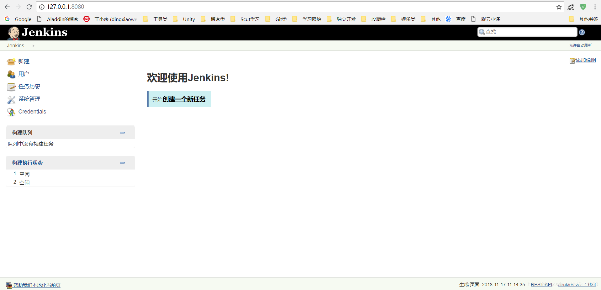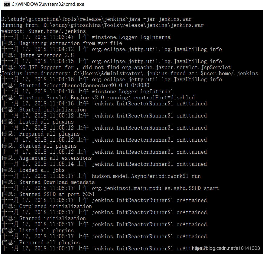 命令行启动Jenkins,java-jarjenkins.war,会看到如下运行即代表启动成功,可以在浏览器输入http://localhost:8080/来测试,会看到进入Jenkins网站。
