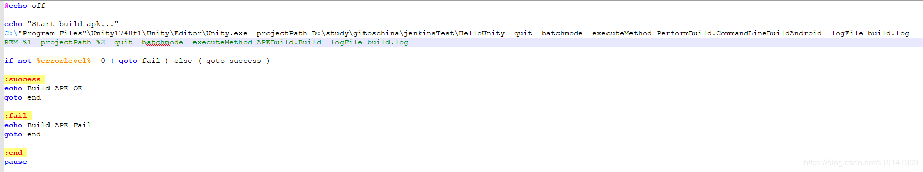 C:\"Program Files"\Unity1748f1\Unity\Editor\Unity.exe -projectPath D:\study\gitoschina\jenkinsTest\HelloUnity -quit -batchmode -executeMethod PerformBuild.CommandLineBuildAndroid -logFile build.log