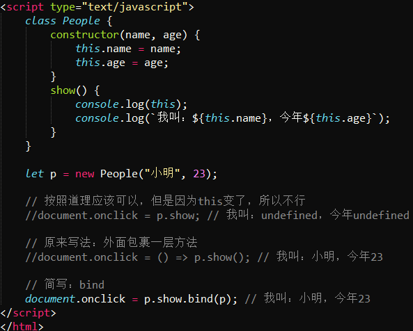 如果指定一个事件执行函数的时候,class里面的this会变化,这时候不想外面套一层方法就可以使用bind。