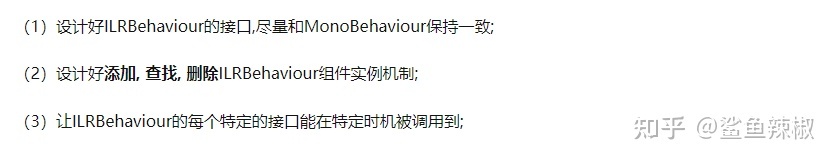 上一节我们详细的讲解了ILRuntime游戏项目框架的启动过程,以及进入到热更项目中的入口,为我们做框架打下了扎实的基础,逻辑热更项目是用C#来完成的,所以我们在逻辑热更项目这里最大限度的保证开发与普通的Unity C#没有太大的差别,所以今天我们来设计基于逻辑热更项目的组件化开发机制,我们叫它ILRBehaviour,类似与MonoBehaviour,尽量保证所有的开发习惯与MonoBehaviour很像,由于MonoBehaviour是Unity C# 域的数据对象类型,所以我们在逻辑热更项目中无法直接使用,所以我们要自己设计一套类式的机制,主要完成3件事情: