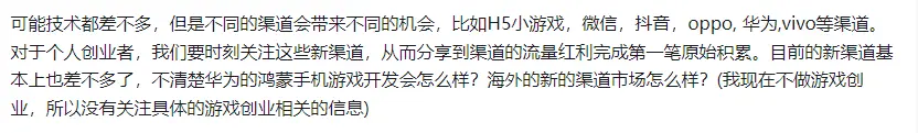 个人开发者想要利用技术创业,缺乏启动资金,融资能力又有限,这个时候最好的办法是持续的关注新的方向和新的机会,只有新的方向和新的机会才是”送钱”。举个例子,微信,抖音小游戏刚出来那会,微信抖音有流量,急需产品,那时候的流量基本不用钱,或很低的价格,你只要做出来了产品,相当于渠道”送钱”给你。如果市场成熟了,产品很多,同质化严重,你会发现流量越来越贵,如果你前期没有完成积累,自然挤不进去市场。微信出来以后,oppo, vivo陆续出来了,前期的流量就是免费和白送,所以我们个人开发者如果没有完成前期积累,一定要all in 新的方向,而不是成熟的市场,这样更容易成功。.