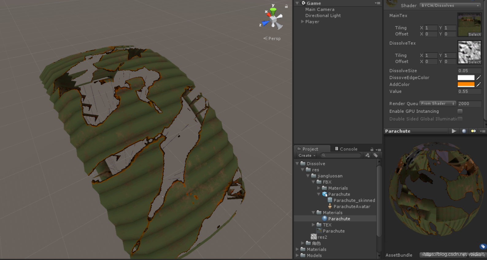 之前玩过一些很有意思的单机游戏,比如生化危机系列,求生之路等。因为比较喜欢恐怖剧情类的游戏,所以像这类的游戏,我都会找着玩。其中有一个游戏,效果做的非常不错,但是我忘记它的名字了。那么我为什么还会记得这个游戏呢,主要是里面有一个细节,主角把一些变异人打死后,那些人身体就像着火了一样,然后慢慢的熔解,最后化为光点消失不见。当然就感觉那个效果真的很牛。当然直到现在,我也是觉得它的效果是不错的,毕竟那个时候的技术和现在还是有所差距的。所以那个时候就能做出这种效果,足以让人感到崇拜。现在从事了游戏开发行业,其实这样的效果,基本可以模拟出来,而且现在的很火的游戏,“吃鸡”里面降落伞的熔解,就和它很像: