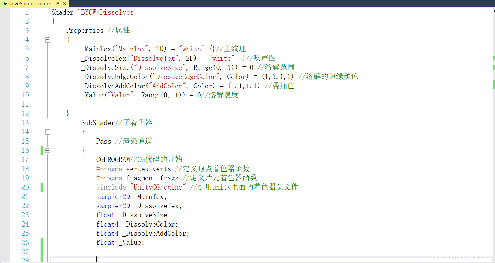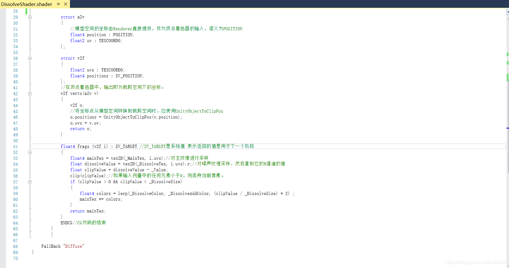 原理很简单,就是对噪声纹理的某个颜色通道取值,然后和用户定义的熔解值进行对比,如果颜色通道的值小于熔解值,难么就实现熔解当前小于溶解值的像素点。那么模拟熔解的化,这里用的是像素剔除(clip)这个函数,Shader内置的函数。然后通过用户改变熔解值的大小,那么最终会有绝大部分都会小于熔解值,所以就会全部被剔除。那么我们不就看不见那些被剔除的像素了吗?然后为了更加逼真,我们模拟一个被烧点的效果,那就是熔解的地方,我们会加上一些被烧的痕迹,这个痕迹就可以用颜色叠加来做。而且还要规定痕迹的大小。嗯,这就是原理。听起来好像不是很懂是把。没关系代码里面写的都很清楚。OK,上代码: