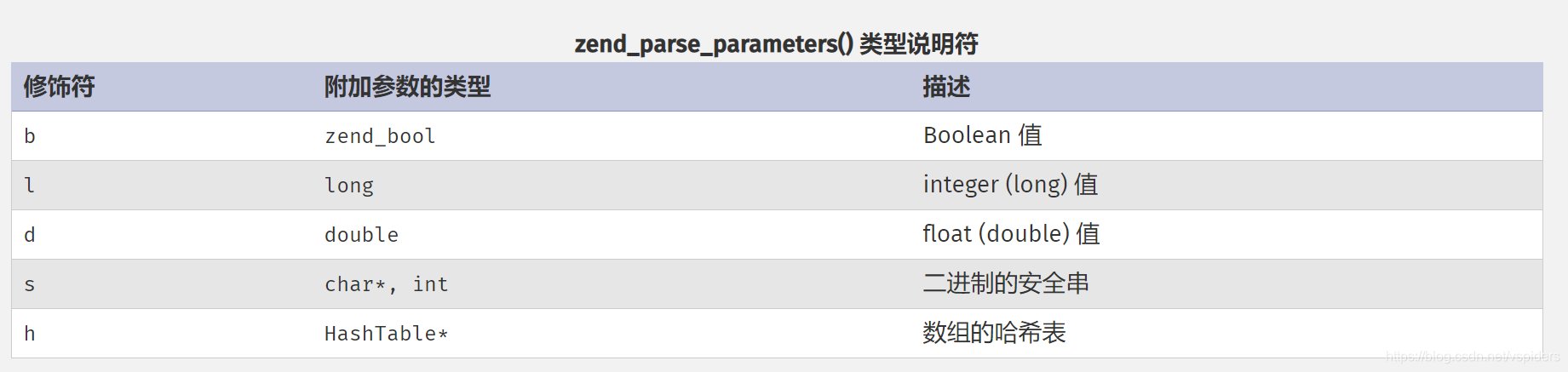 其中zend_parse_parameters用来获取函数参数并进行校验,第一个参数是接受的参数,第二个参数表示指定函数的参数类型,后面就是要解析的参数,参数类型对应说明符如下,