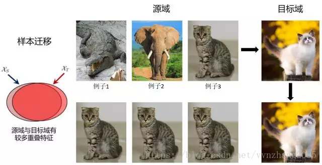 尽管source domain数据不可以整个直接被用到target domain里,但是在source domain中还是找到一些可以重新被用到target domain中的数据。对它们调整权重,使它能与target domain中的数据匹配之后可以进行迁移。盗一张图,比如在这个例子中就是找到例子3,然后加重它的权值,这样在预测的时候它所占权重较大,预测也可以更准确。