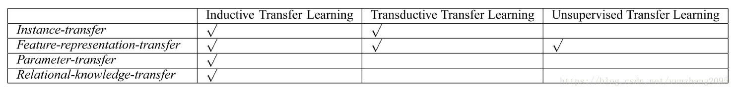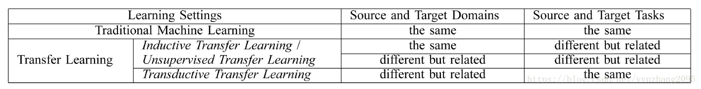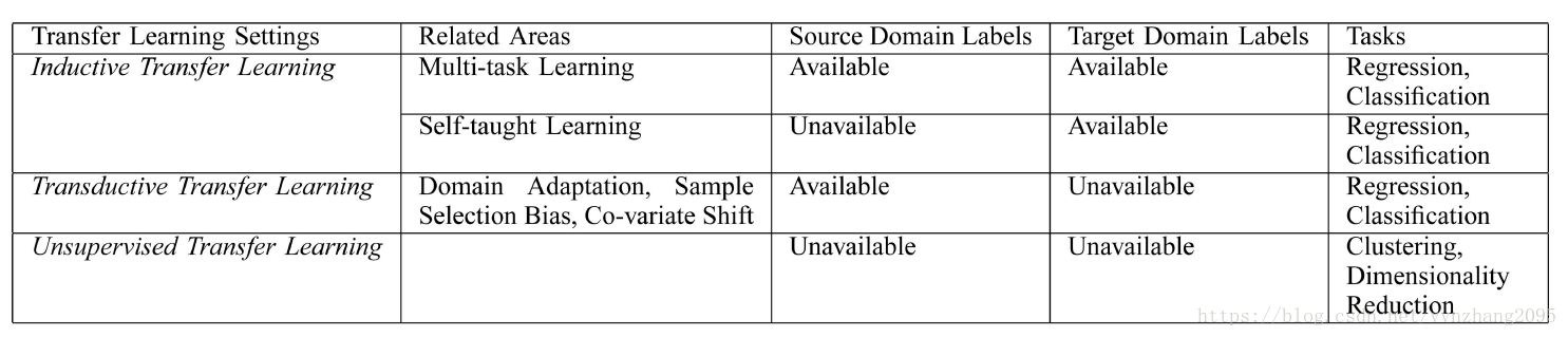 直接看这两个表。值得注意的是,第一张表中Inductive TL和Unsupervised TL之间是用“/”隔开的,什么意思呢?再看看Inductive TL的定义,是说tasks不一样,但domain可能一样可能不一样,不一样的时候就可以称为Unsupervised TL。不过Unsupervised TL会更关注unsupervised的任务。
