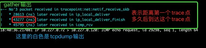 netcap skb -f tracepoint:net:netif_receive_skb,ip_local_deliver@1,ip_local_deliver_finish@3,icmp_rcv@1 -e "host 10.227.0.72 and icmp" -i eth0 --gather --gather-output-color cyan可以观察到输出如下,根据到达 trace 点的时间,就能够分析出数据包性能损耗在哪里,或者在哪里可能引入了延迟。