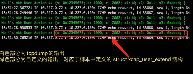 struct xcap_user_extend { int a; // format: 0x%x uint32_t b; // int64_t c; uint8_t x1; // format: %c uint8_t x2; // format: 0x%x uint16_t x3; // format: 0x%x }; // Return 0 means not need to ouput static inline int xcap_user_action(void *ctx, void *pkt, u32 pkt_len, struct xcap_user_extend *user, u16 trace_index) { user->a = 0x12345678; user->b = 1000; user->c = 2002; user->x1 = 'M'; user->x2 = 0x11; user->x3 = 0xabcd; return 1; }其中 struct xcap_user_extend 是用户自定义的结构体,想输出什么信息,就在这个结构体定义并赋值即可。结构体可支持的类型如下 (注:不支持指针,也不支持数组):int8_t, uint8_t, char, int16_t, uint16_t, int, uint32_t,int64_t, uint64_t 。