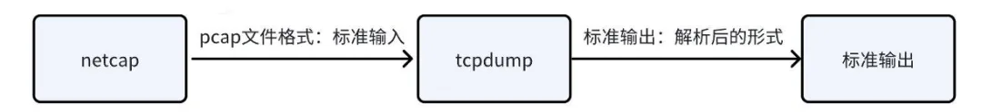 netcap 程序启动后,也会启动一个 tcpdump 的程序,tcpdump 的标准输入接收 pcap 格式的输入流,然后以不同的参数(例如 -e 是显示 mac 地址)从其标准输出打印出解析后的格式。如下图所示: