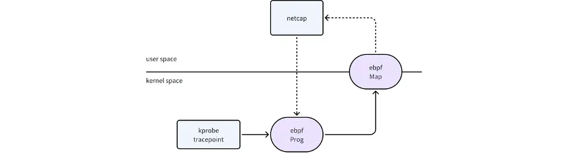 netcap 通过 kprobe /tracepoint 方式实现函数的 hook,通过函数参数获取 skb 和 sock 关键结构体,拿到网络包的数据,通过 bpf map 和用户态进行数据传递。