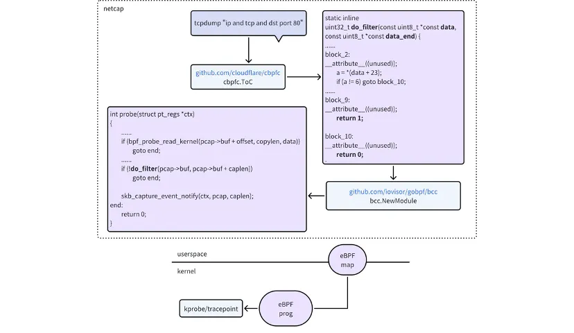 tcpdump 的过滤语法是基于 cBPF 的,使用开源库:https://github.com/cloudflare/cbpfc 这里可以把 tcpdump 的过滤语法转化成一个 C 函数,这个 C 函数可以嵌入到 netcap 的 eBPF 的程序中。转成 C 函数的基本原理如下:先利用 libpcap 库把 tcpdump 过滤语法转成 cBPF 指令码,然后基于此指令码转化成 C 语言的函数。如下图所示: