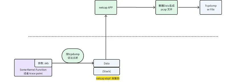 netcap 的 工作原理大体如下:在 eBPF 程序中完成数据包的过滤,找出 tcpdump 语法过滤的包,然后把这个包给到 netcap 应用程序,netcap 应用程序再把这个包发去给 tcpdump 显示,或者直接输出 pcap 文件。如下图所示: