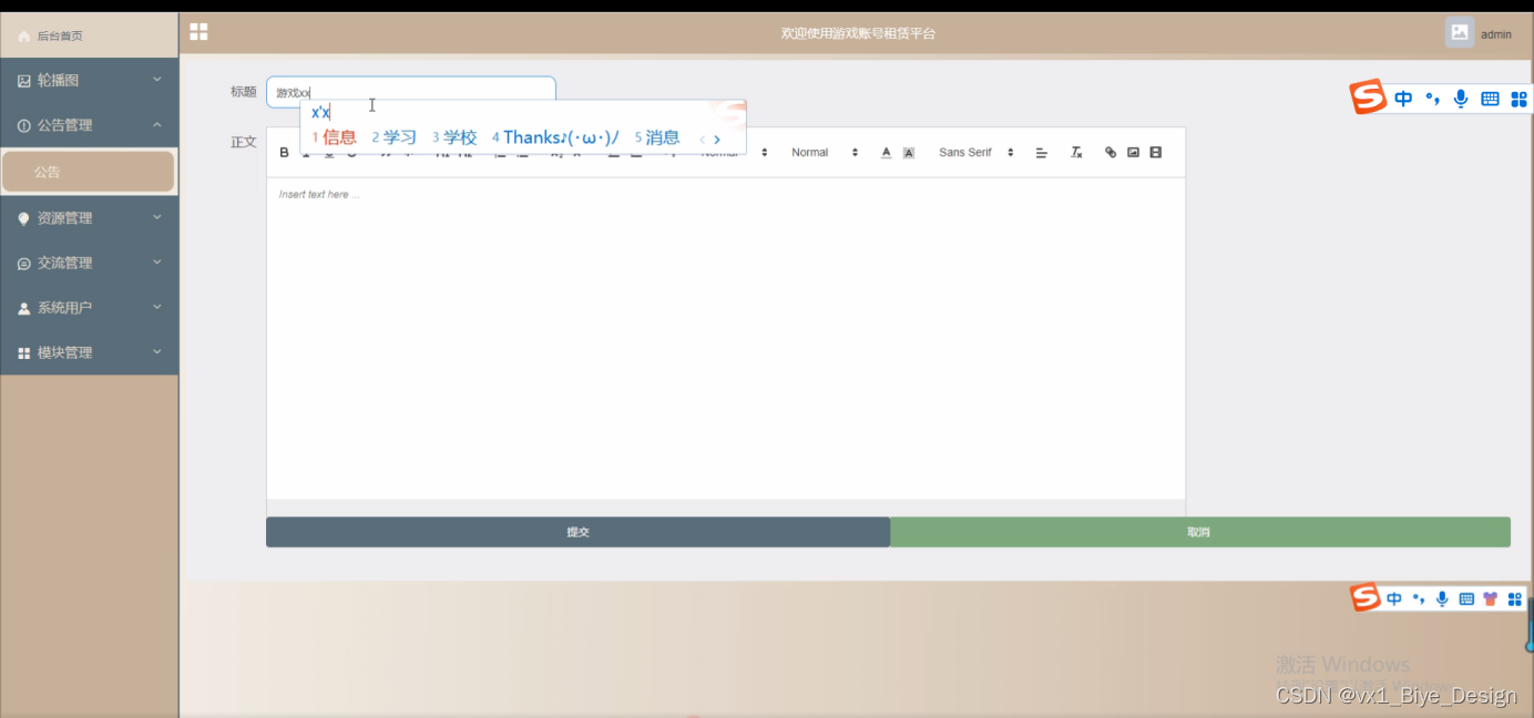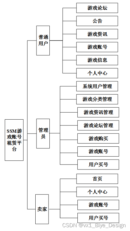 本系统主要分为前端和后端两大板块,其中包括了用户管理、留言管理、游戏分类管理、游戏账号管理、游戏论坛管理、官方账号管理、官方论坛管理、系统管理等功能模块。