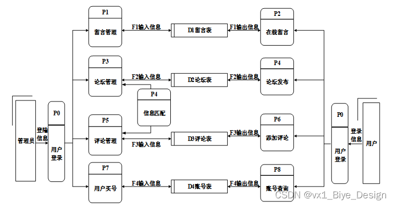 2层数据流图中,数据流实体主要是管理员,数据流程包括论坛管理、游戏账号管理;数据流包括添加信息、删除信息、修改信息、查询信息、浏览信息、提示信息;数据表包括游戏账号表、游戏论坛表。
