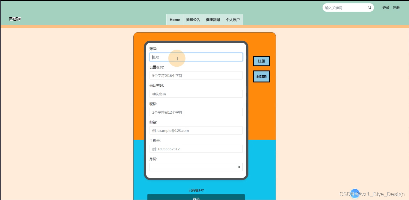 (1)用户注册登录:游客可以随时进入到系统中,对系统中的信息浏览,但是想要实现体检信息以及健康日志等操作,就必须有这个系统的账号,如果没有账号的话,可以注册以后进行相关的操作,同时用户还可以通过“个人账户”这以按钮对个人信息以及操作的信息进行管控。