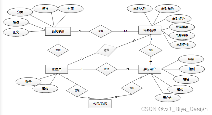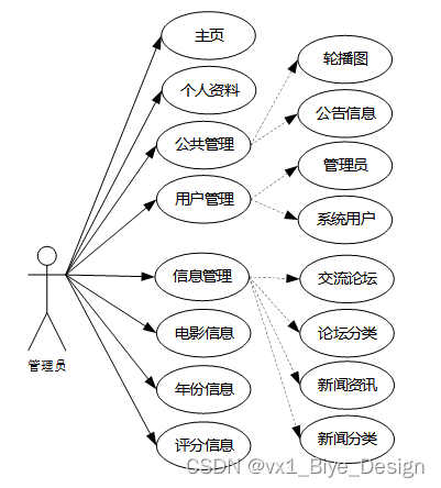 管理员主要负责公共管理(轮播图,公告信息),用户管理(管理员,系统用户),信息管理(交流论坛,论坛分类,新闻资讯,新闻分类),电影信息,年份信息,评分信息等的管理,下图所示描述管理员的用例图。