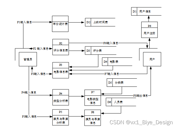 如下为系统的顶层数据流图,外部实体有用户和管理员,分别对系统输入数据,从而得到要输出的数据。