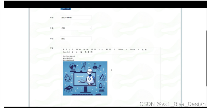 管理员在此管理界面可以维护管理论坛帖子,包括标题,封面图,分类,标签等信息,可以进行查询,重置,删除,新增等操作,界面如下所示。