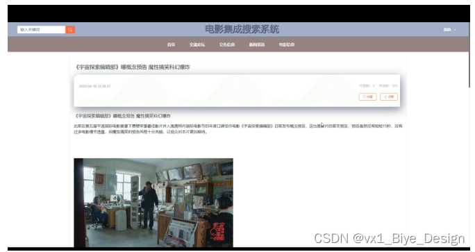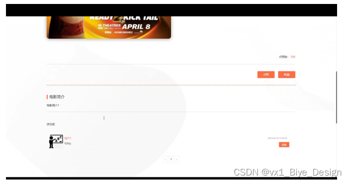 系统用户在此页面可以查看推荐的电影信息,也可以通过搜索,排序等方式查找影片,在详情页面可以进行点赞,收藏,评论等操作,如下图所示。