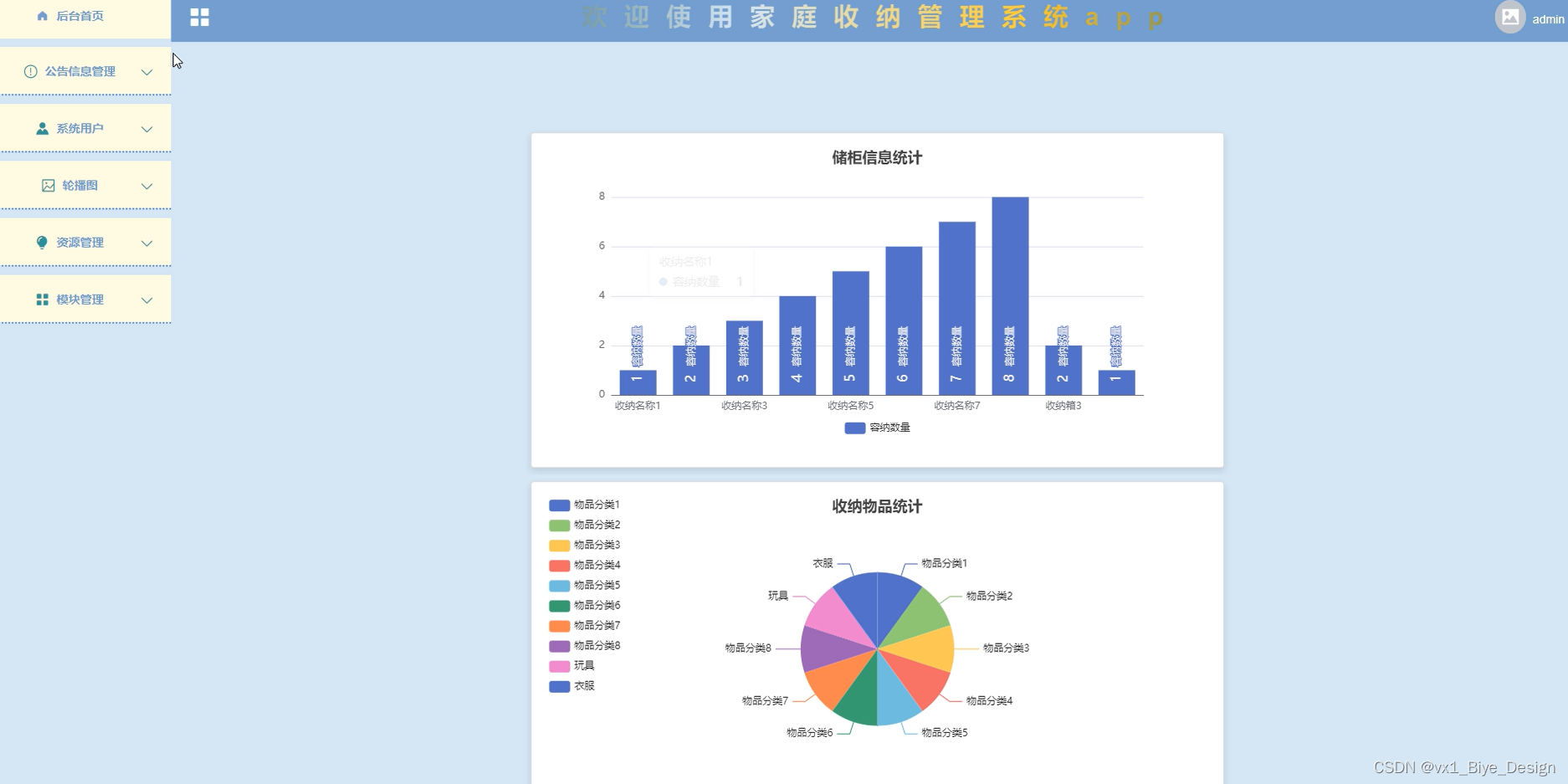 管理员后台;后台首页、公告信息管理、系统用户(管理员、系统用户)、轮播图、资源管理(新闻列表、新闻分类列表)、模块管理(物品分类、储柜信息、收纳物品、物品处理、提醒通知)等。