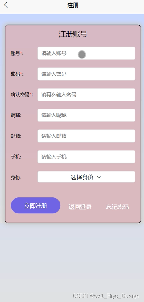 在注册页面可以填写账号、密码、昵称、邮箱、手机、身份、用户姓名、用户性别等信息,进行注册如图5-7所示。