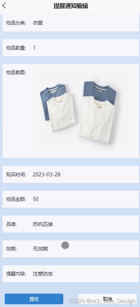 在提醒通知页面可以填写物品分类、物品数量、物品截图、购买时间等信息进行提交,如图5-14所示。