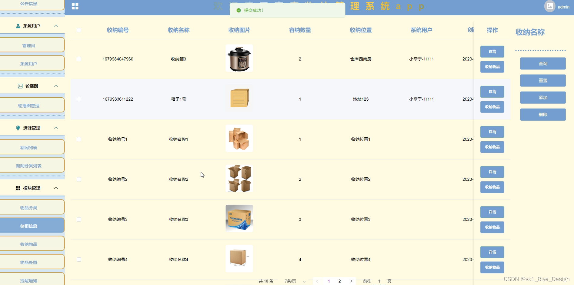 模块管理:通过模块管理可以查看物品分类、储柜信息、收纳物品、物品处理、提醒通知的信息,进行查询、重置、删除、添加等操作,如图5-6所示;