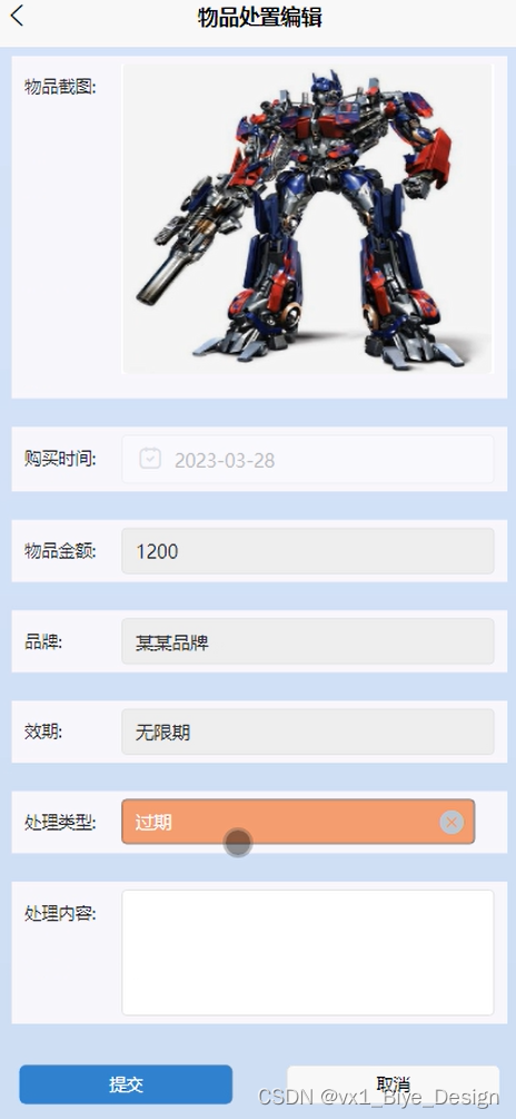 在物品处理页面可以填写物品截图、购买时间、物品金额、品牌、处理类型等信息进行提交,如图5-13所示。