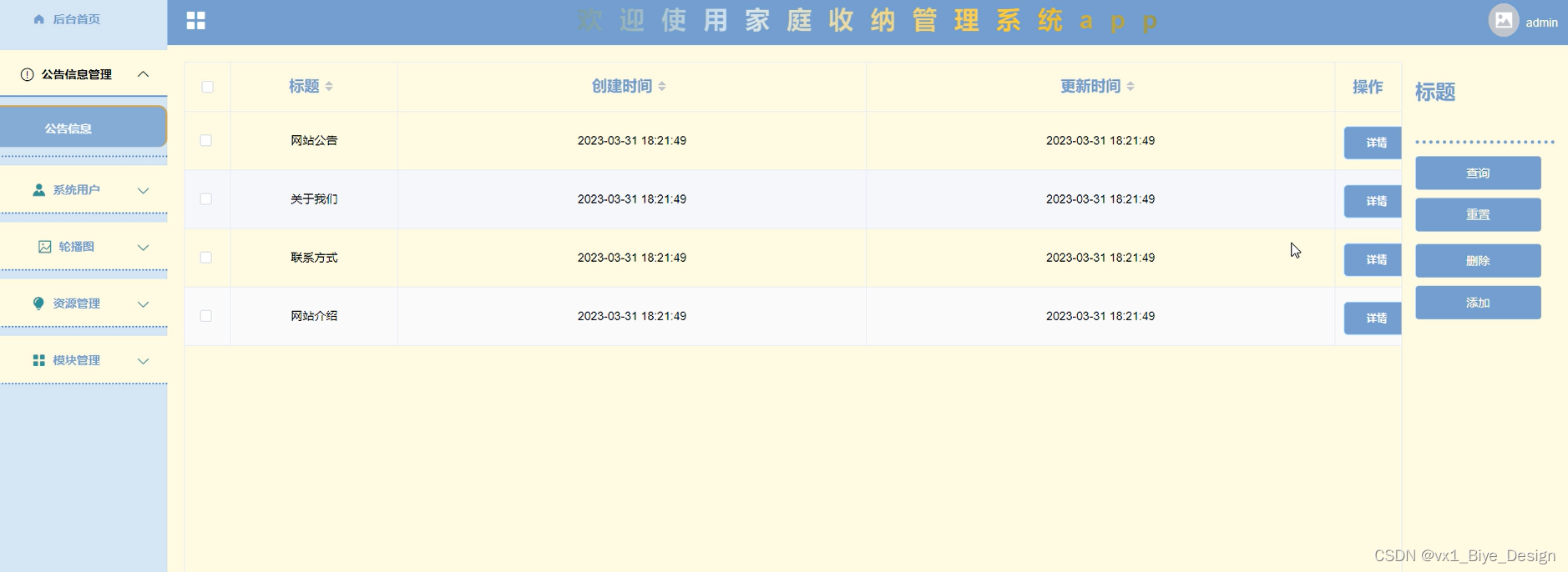 公告信息管理:通过公告信息可以查看标题、创建时间等信息进行详情或修改、删除操作,如图5-4所示;