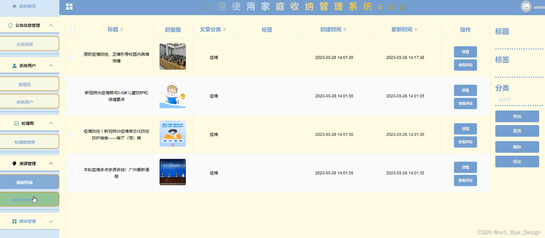 资源管理:通过资源管理可以查看新闻列表、新闻分类列表获取索标题、封面图、文字分类等信息,进行查询、重置、删除、添加等操作,如图5-5所示;