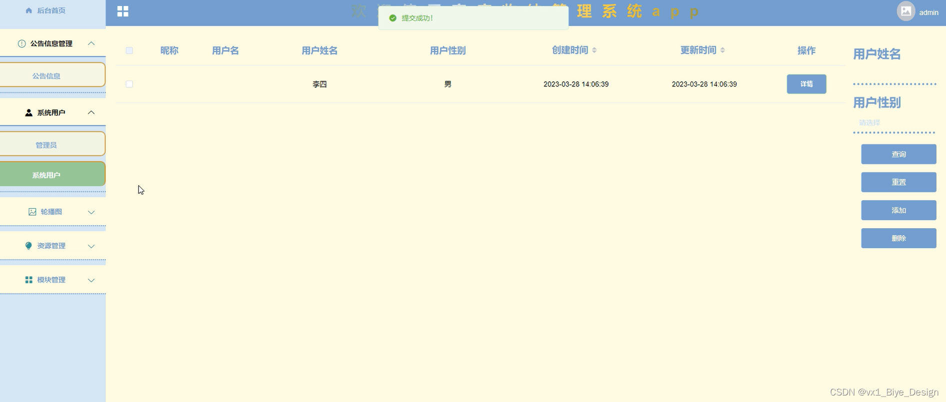 系统用户:在此页面可以查看昵称、用户名、用户姓名、性别等信息,进行查询、重置、删除、添加等操作,如图5-3所示;