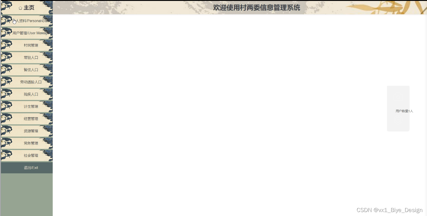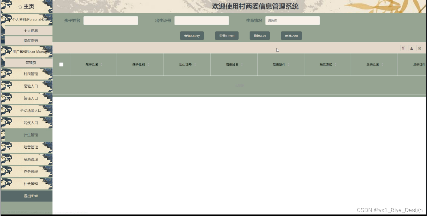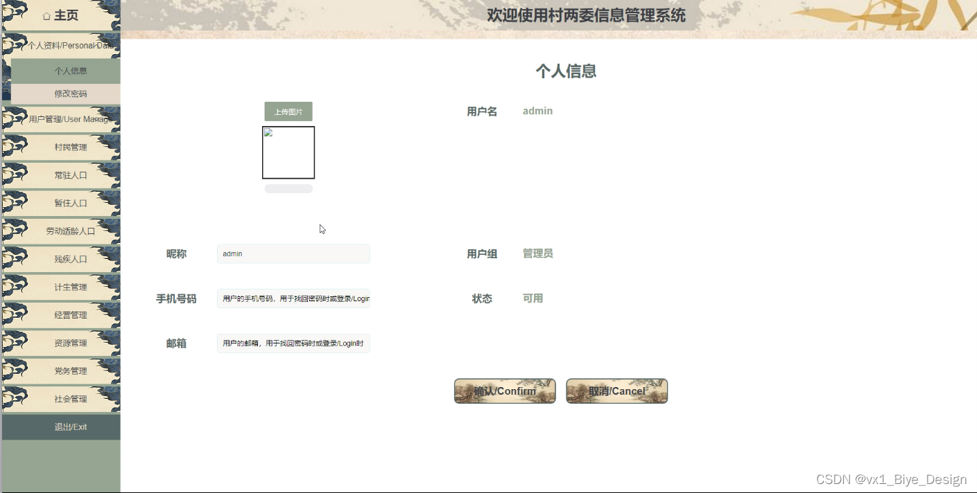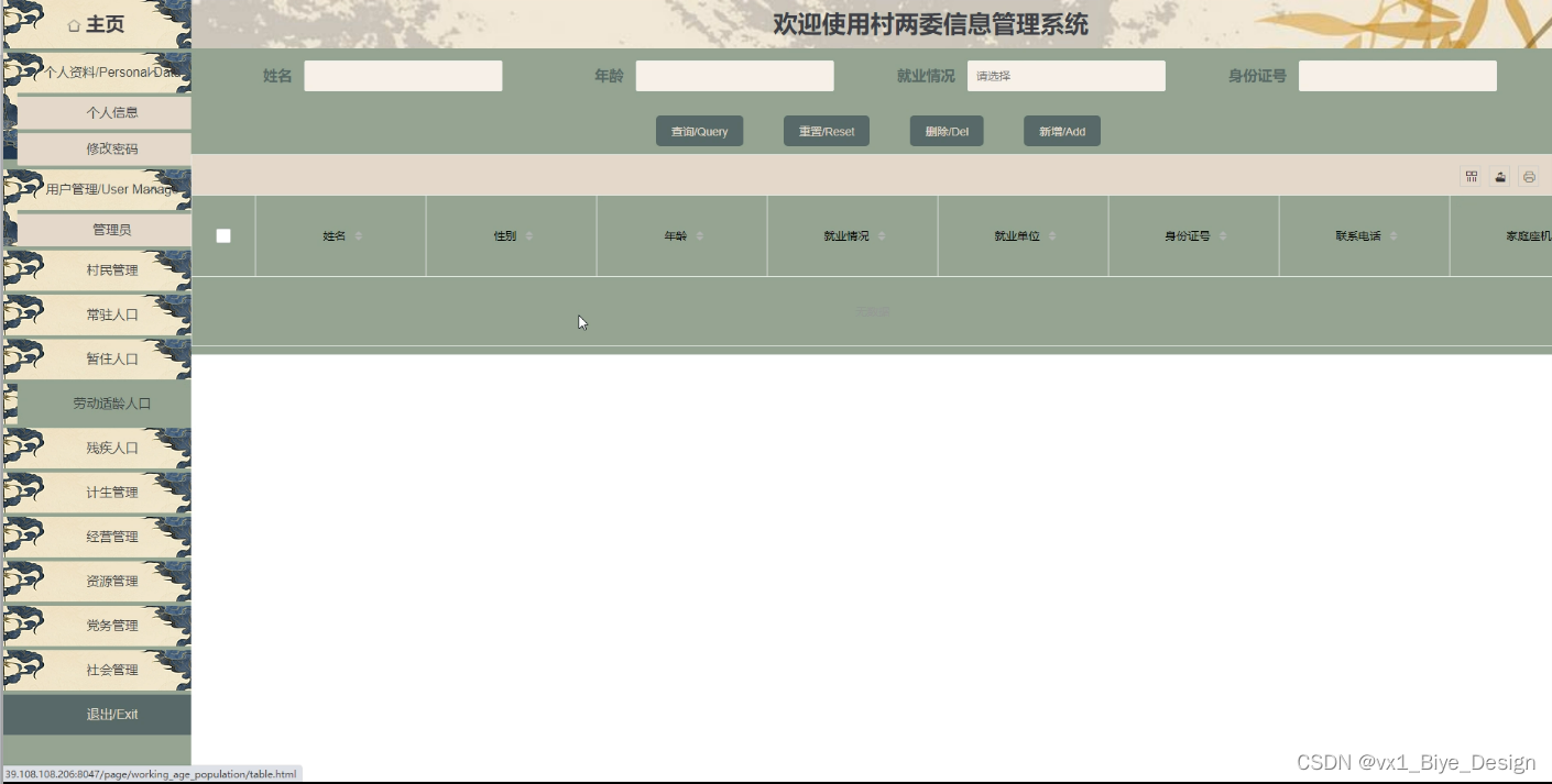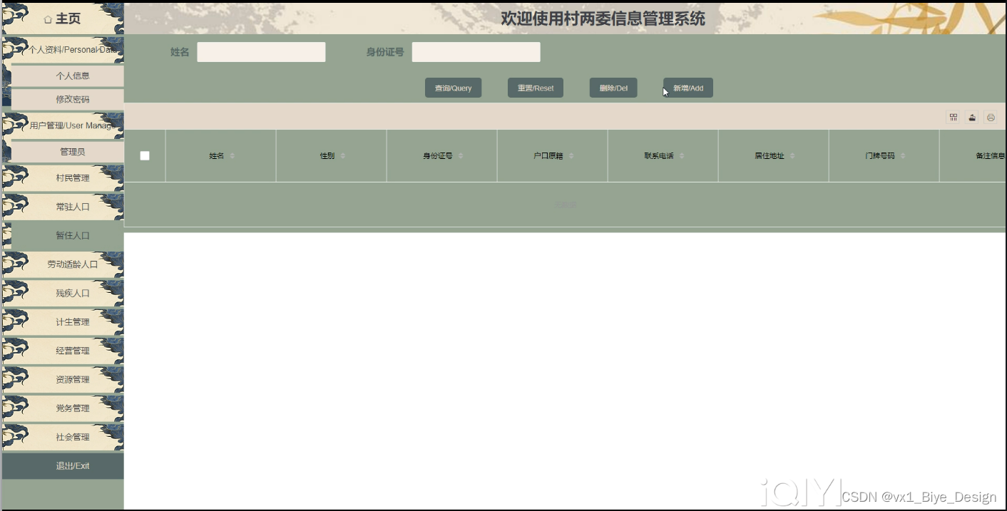 模块包括主界面:首页、个人资料(个人信息、修改密码)、用户管理(管理员)、村民管理、常驻人口、暂住人口、劳动适龄人口、残疾人口、计生管理、经营管理、资源管理、党务管理、社会管理等进行相应的操作。