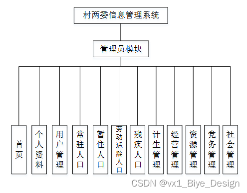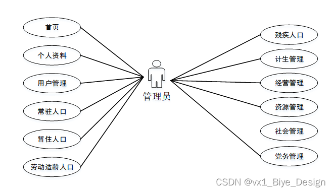管理员登录后可进行首页、个人资料(个人信息、修改密码)、用户管理(管理员)、村民管理、常驻人口、暂住人口、劳动适龄人口、残疾人口、计生管理、经营管理、资源管理、党务管理、社会管理管理,管理员用例如图3-1所示。
