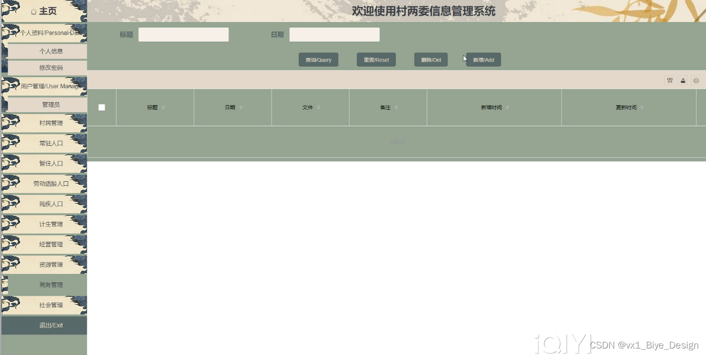 系统管理也都将通过计算机进行整体智能化操作,对于村两委信息管理系统所牵扯的管理及数据保存都是非常多的,例如首页、个人资料(个人信息、修改密码)、用户管理(管理员)、村民管理、常驻人口、暂住人口、劳动适龄人口、残疾人口、计生管理、经营管理、资源管理、党务管理、社会管理等,这给管理者的工作带来了巨大的挑战,面对大量的信息,传统的管理系统,都是通过笔记的方式进行详细信息的统计,后来出现电脑,通过电脑输入软件将纸质的信息统计到电脑上,这种方式比较传统,而且想要统计数据信息比较麻烦,还受时间和空间的影响,所以为此开发了村两委信息管理系统;为用户提供了方便管理平台,方便管理员查看及维护,并且可以通过需求进行设备信息内容的编辑及维护等;管理员可以足不出户就可以获取到系统的数据信息等,而且还能节省用户很多时间,所以开发村两委信息管理系统给管理者带来了很大的方便。