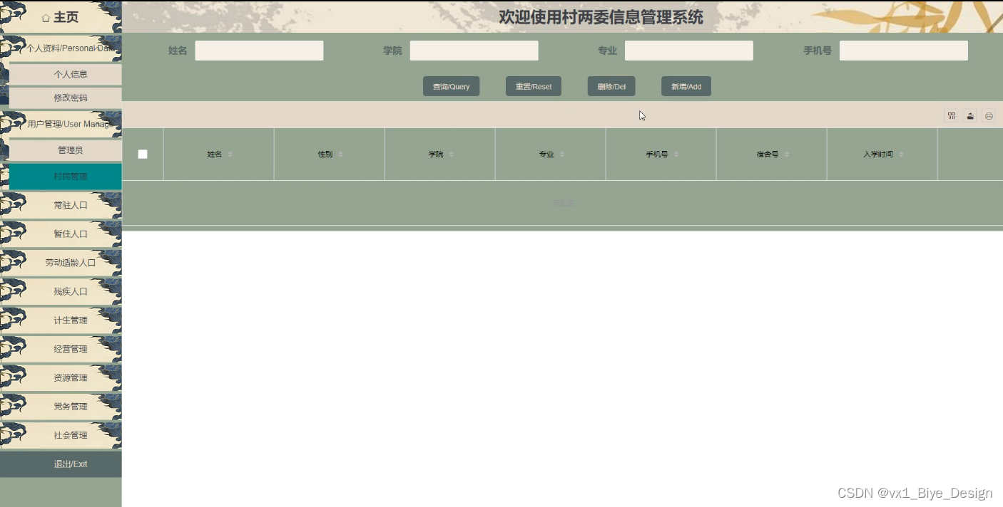 村民管理:在村民管理页面可以查看索引、姓名、学院、手机号、入学时间、性别、专业、宿舍号等信息,进行添加、修改或删除操作,如图5-6所示。
