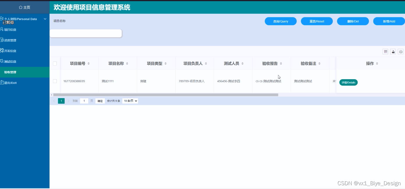 (4)验收管理:点击“验收管理”这个菜单,可以查看到系统中所有添加的验收管理,支持通过项目名称或者项目类型对验收管理进行查询,如果想要了解某一验收管理的详细信息,点击后面的“详情”会进入详情界面;