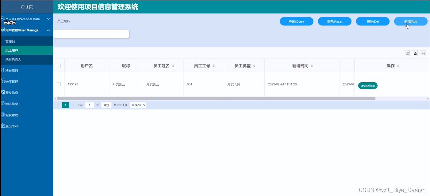 (1)用户管理:管理员可以对系统中所有的用户角色进行管控,包含了管理员以及员工用户、项目负责人这三种角色,如果需要添加新的用户,点击页面中的“添加”按钮根据提示输入上用户信息,点击“提交”以后在对应的用户界面就可以查看到了,可以点击用户后面的“删除”按钮直接删除某一用户。