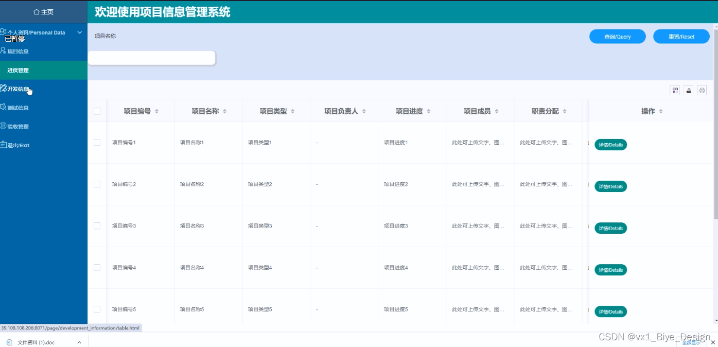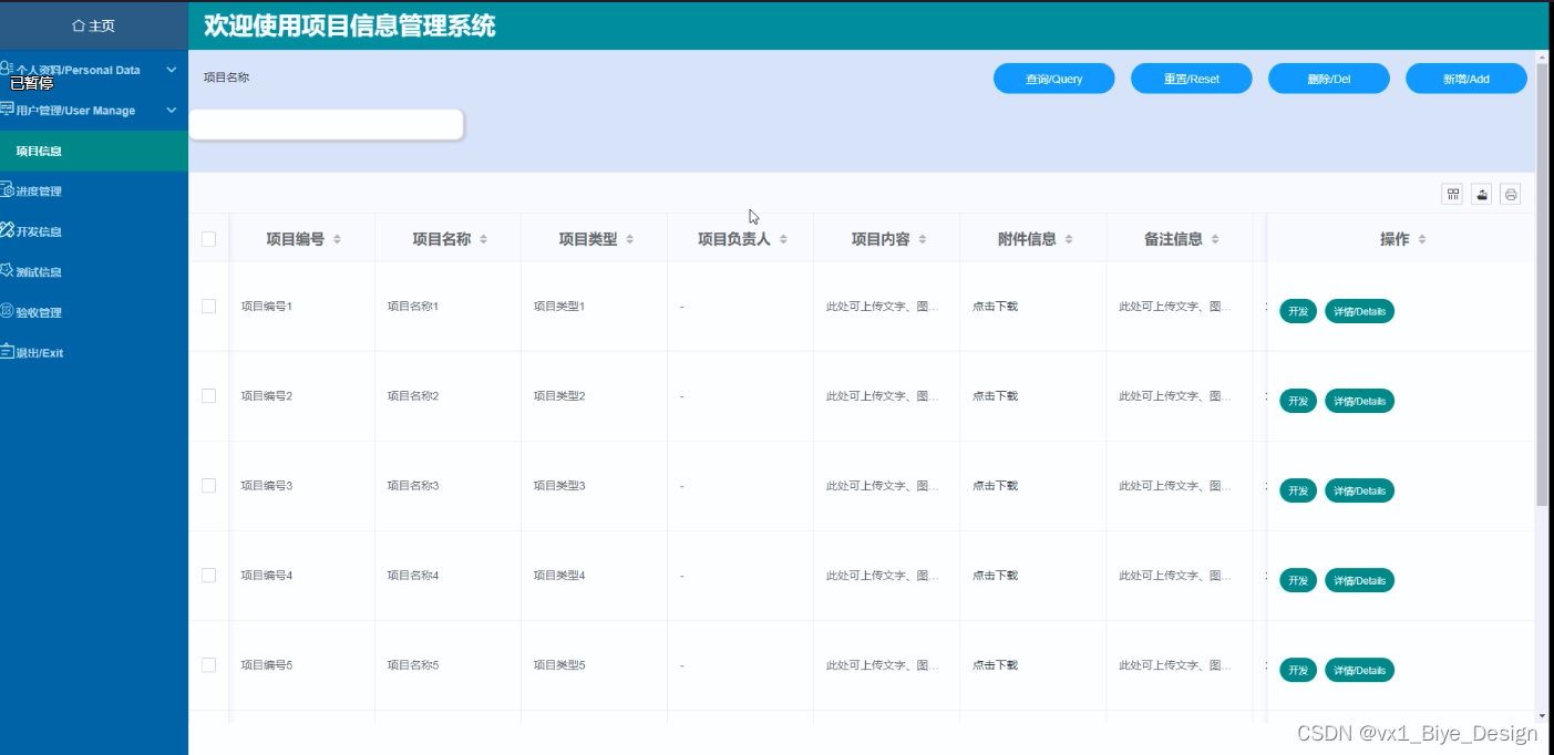 (2)项目信息:点击“项目信息”这一按钮可以查看到系统当中所有的项目信息,支持通过项目编号或者项目名称进行查询项目信息,如果想要添加新的项目信息,点击“添加”按钮,然后根据提示填写好项目信息的具体信息,点击提交所添加的项目信息在数据库就保存下来了,同时可以点击“开发”按钮,输入项目信息的开发信息进行提交,也可以选择要删除的项目信息直接点击“删除按钮”进行项目信息删除。