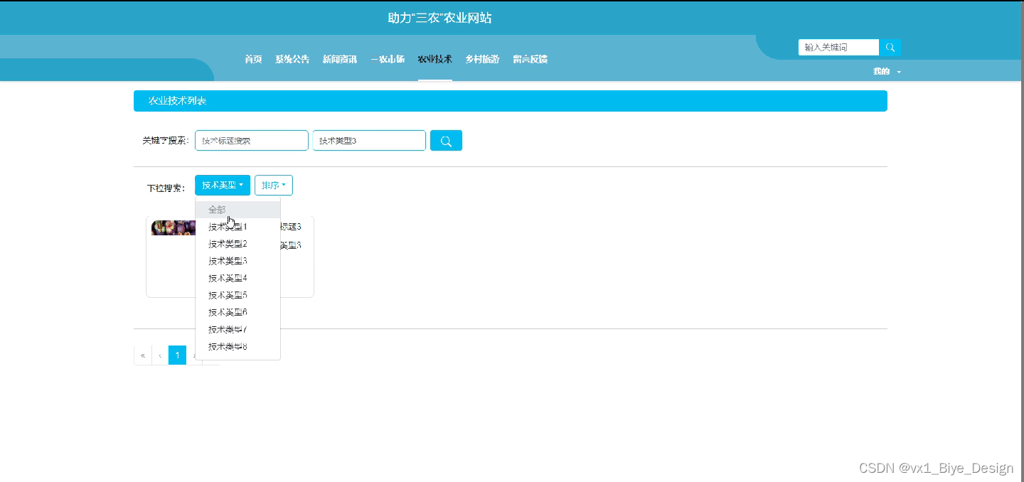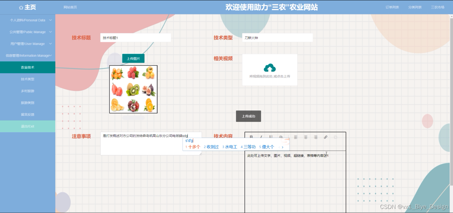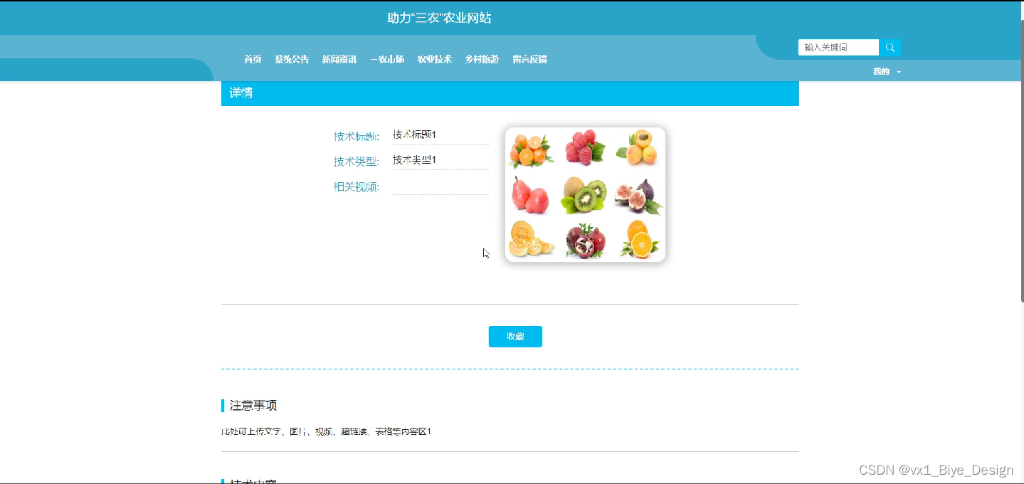 农业技术:用户在此页面可通过关键字等方式搜索查看农业技术信息,如:技术标题、技术类型、相关视频、图片、注意事项、技术内容等详细信息,可进行收藏、评论等操作,如图5-14 5-15所示。